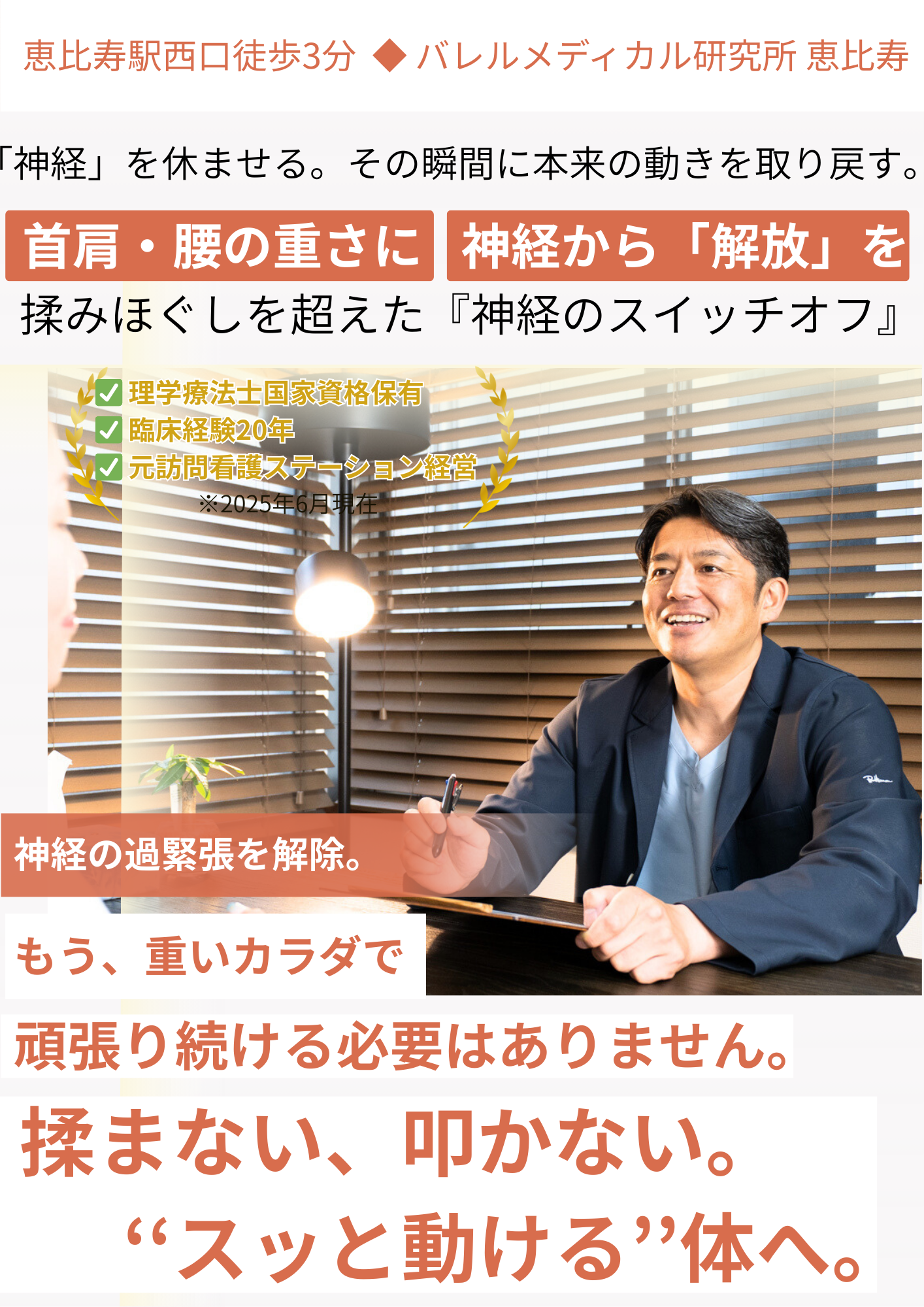 今、私の院には「どこに行っても変わらなかった」という方がたくさん来られます。 そんな方々の体が、神経へのアプローチで劇的に変わっていく姿を見るたびに、私は思います。「あの時、言い訳をして諦めなくて本当によかった」と。